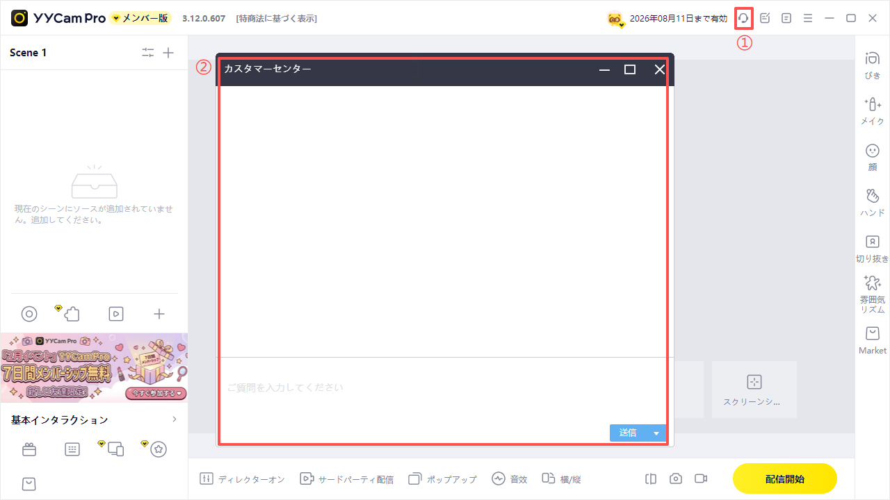 手順:YYCam Pro を起動 → 右上の 「カスタマーサービス」 → 1対1チャットで問い合わせ/フィードバック送信
