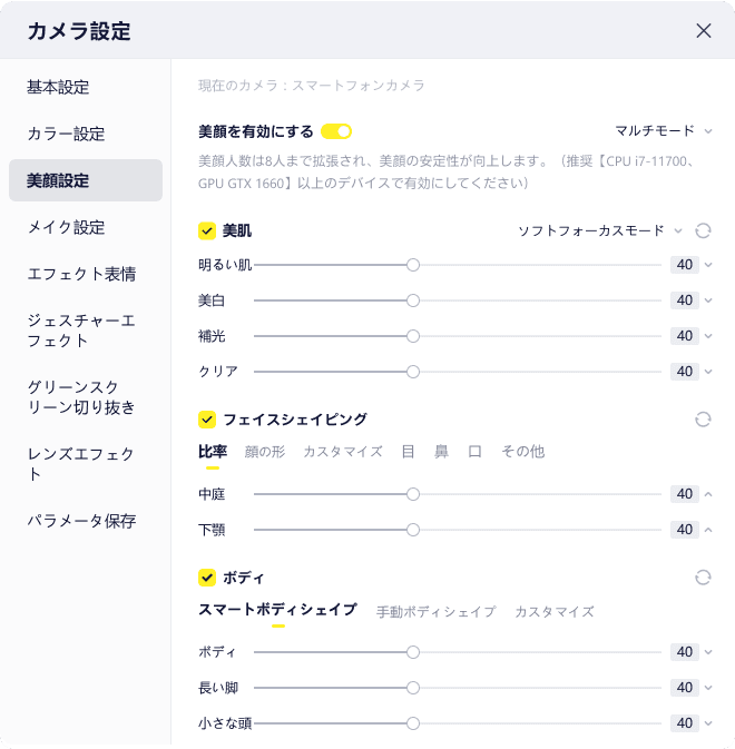 映像調整、美顔補正、音声・映像エフェクト、配信テンプレなど多機能サポート