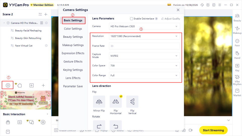 - Go to Basic Settings and adjust parameters as needed. Recommended settings: 1920×1080 resolution and 30 fps.