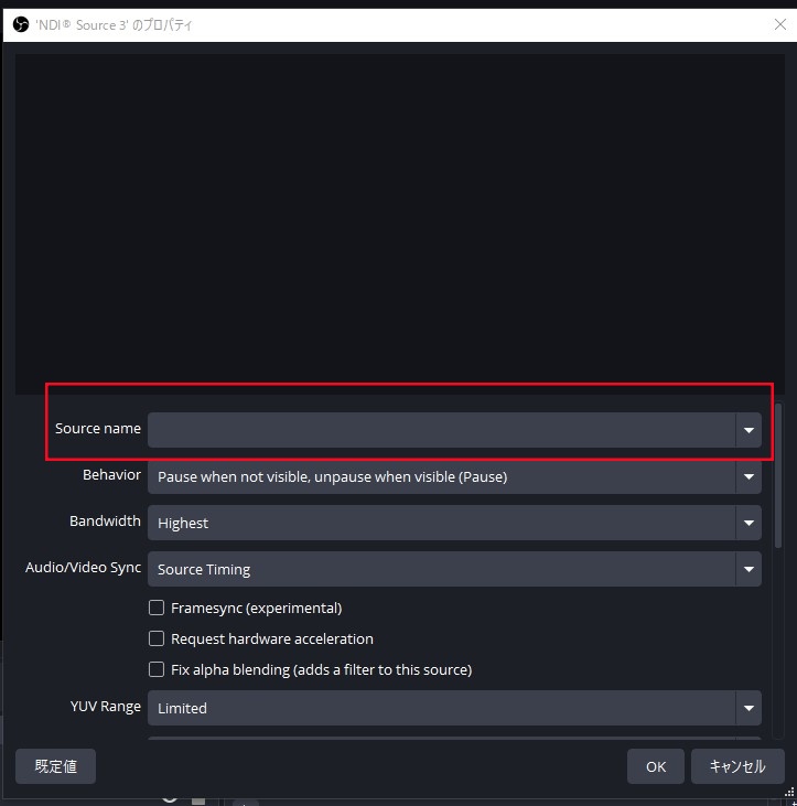 3. 利用可能な NDI ソース一覧から、OBS で設定した名称を選択します。