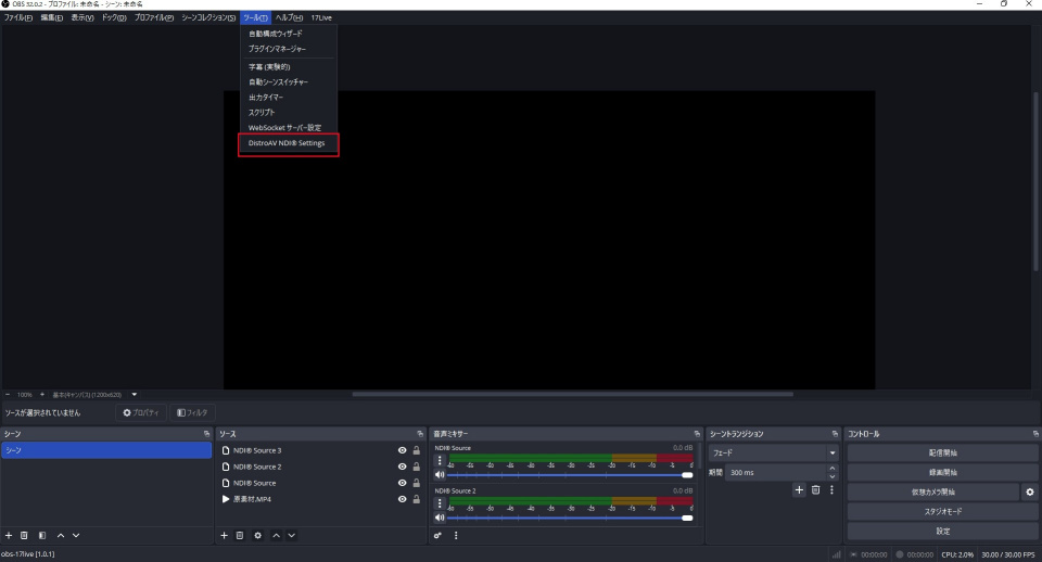 - OBS のメニューバーから「ツール」→「DistroAVNDI Settings」を選択します。