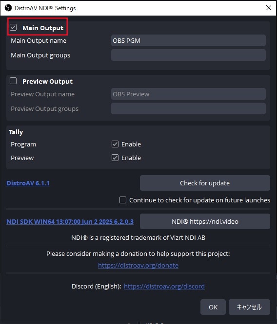 - OBS用 NDI プラグイン:OBS に NDI が内蔵されていない場合は、obs-ndi(DistroAV)プラグインをインストールしてください。 ダウンロード:https://github.com/DistroAV/DistroAV/releases