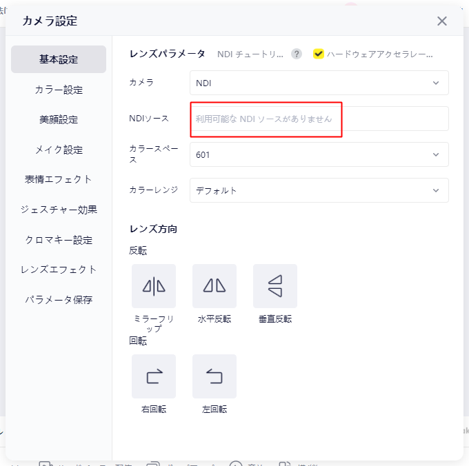- エコーが発生する場合:「マイク入力」と「NDI 経由の音声」を同時に取り込んでいないか確認