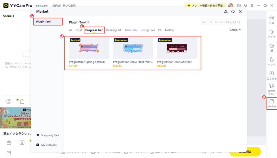 YYCam Proをご利用いただきありがとうございます!YYCam Pro ストアでは、ライバー向けにさまざまなライブ配信プラグインツールをご提供しています。本ガイドは、プラグインの取得方法や【プログレスバー類プラグイン】の主な使用方法を素早く理解いただけるよう、お手伝いいたします。これにより、ライブ配信のインタラクションを効率よく管理し、配信ルームの表現力と雰囲気を大幅に向上させることが可能になります。