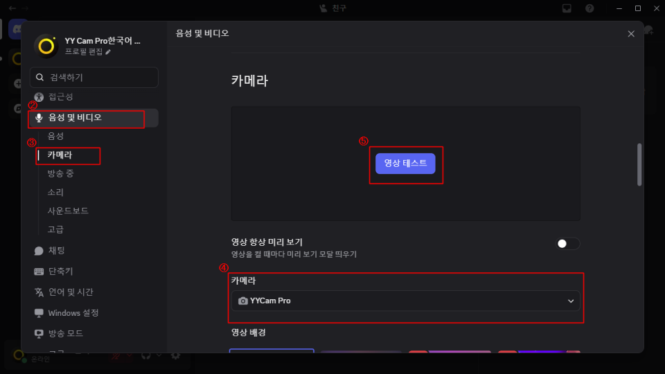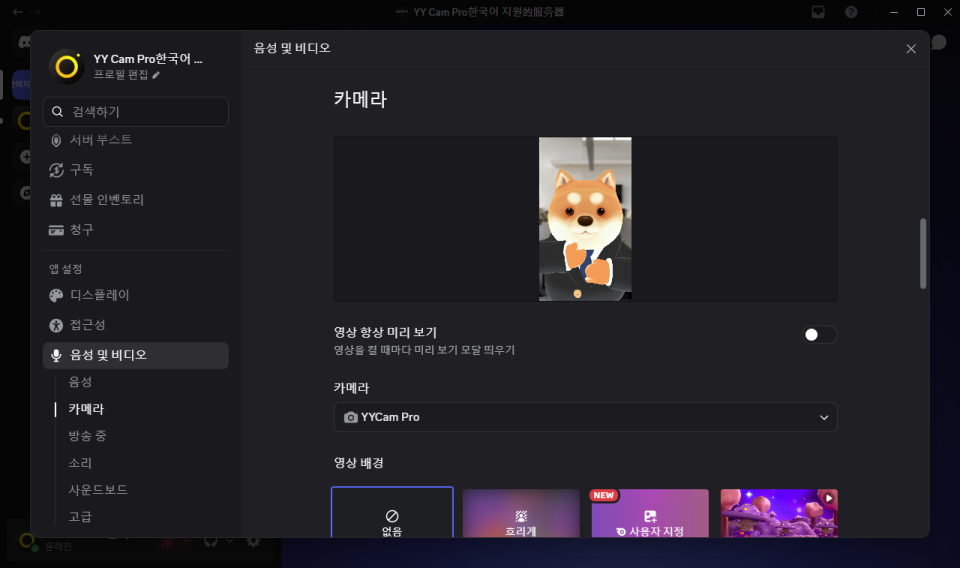 - Discord에서 비디오 켜기(YYCam Pro 가상 카메라 사용)
