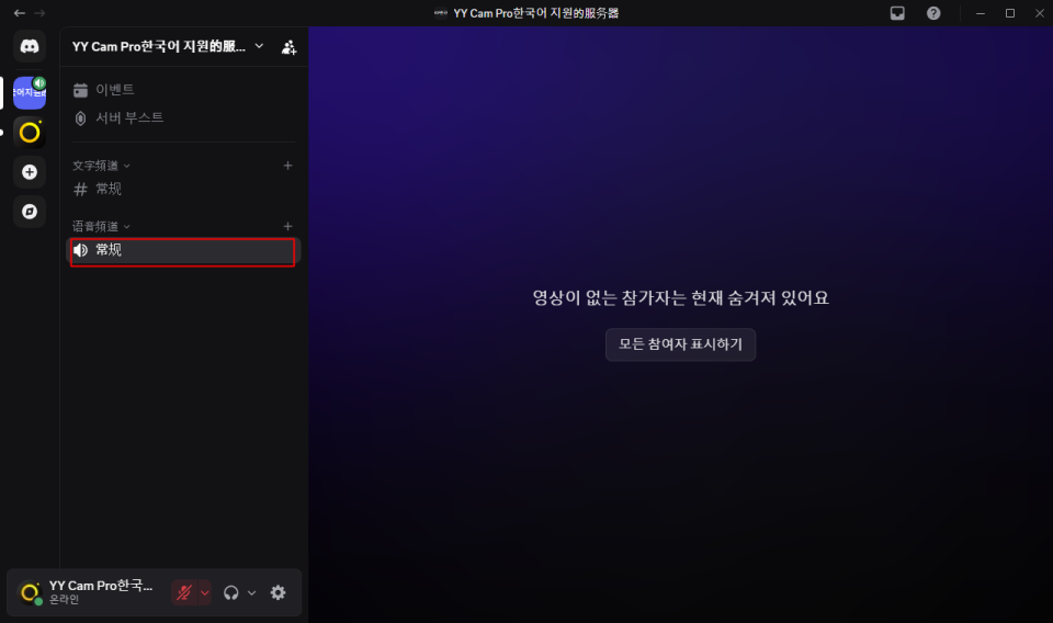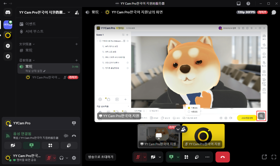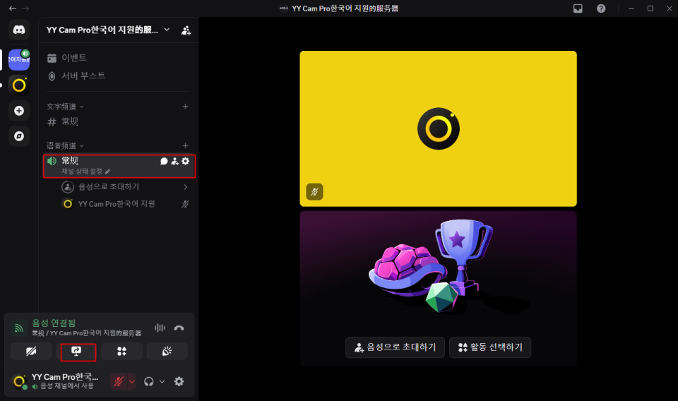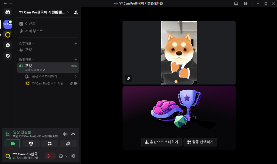 - 원하는 음성 채널에 입장한 뒤, 하단의 【카메라 켜기】 버튼을 클릭하면 YYCam Pro 화면이 Discord에 동기화되며 라이브를 시작할 수 있습니다.