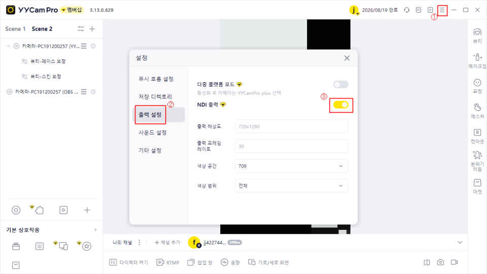 단계 1: YYCam Pro에서 NDI 출력 활성화
