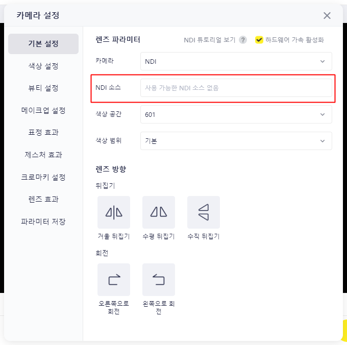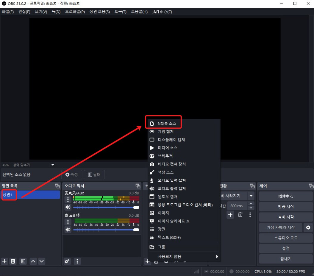 (해당 항목이 표시되지 않는 경우, NDI 플러그인이 정상적으로 설치되지 않은 것입니다.)