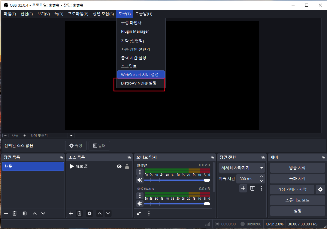 1.OBS 상단 메뉴에서 '도구' → 'DistroAVNDI설정'을 선택합니다.