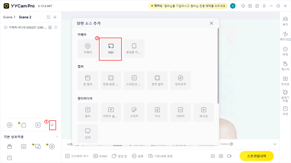 2.영상 소스 추가 영역에서 '+' 버튼을 클릭한 후, 소스 유형으로' NDI'를 선택합니다.