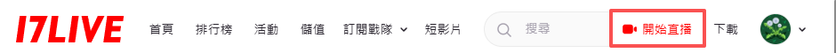 ● 登入後,前往上方的導覽列,點選「17LIVE」→「17LIVE 功能塢」→「開始直播」,並進入直播設定。