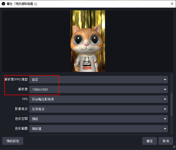 - 解析度/FPS類型:選擇「自訂」