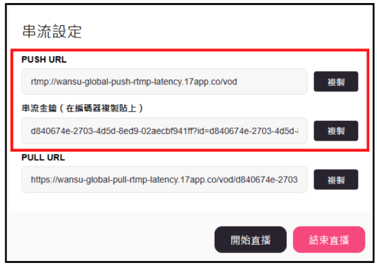 - 普通直播模式:頁面會顯示「PUSH URL」與「串流金鑰」