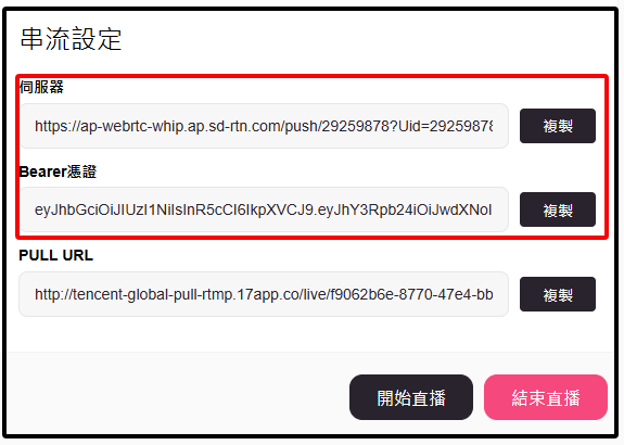 - 派對直播模式:頁面會顯示「伺服器」與「Bearer憑證」