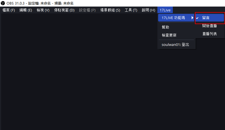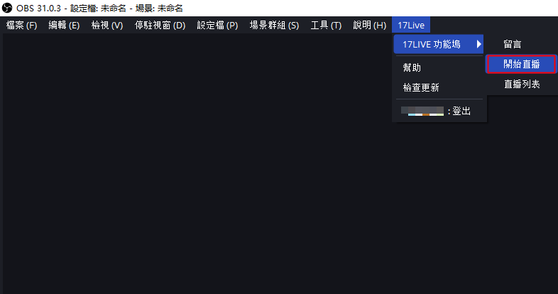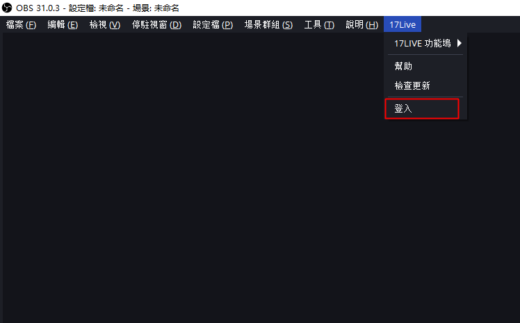 ● 重新啟動OBS後,請點選「17LIVE」→「登入」,使用您的 17LIVE 帳號登入。